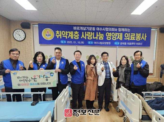 ![]() 바르게살기운동 여수시협의회(회장 박정완)와 여수시립요양병원(원장 장정우)는 지난 16일 65세 이상 둔덕동 취약계층 어르신 50명에게 영양수액을 투여하는 의료봉사를 진행했다. |