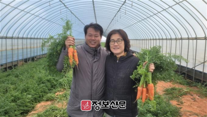 시설하우스에서 ‘유기농 당근’을 수확하는 무안 강행원(51) 친환경농업협회장은 2002년 무안 현경면에서 부인 정수현 씨와 함께 친환경농업을 시작, 22년째 실천하고 있다.