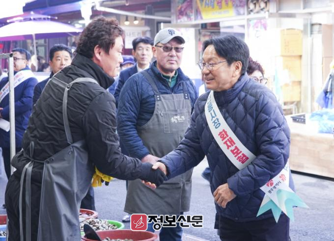 강기정 시장은 21일 설 명절을 앞두고 광산구 송정매일시장을 찾아 지속되는 경기침체와 소비심리 위축으로 어려움을 겪고 있는 상인들을 직접 만나 현장의 목소리를 듣는 등 민생 소통에 나섰다.
