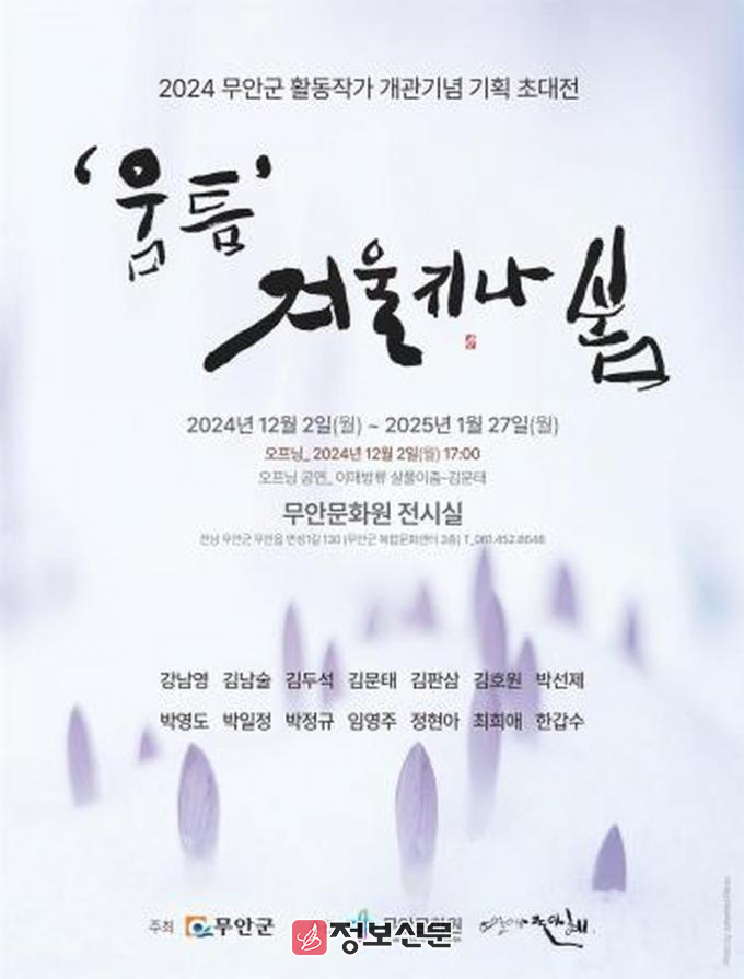 이번 <‘움틈’ 겨울지나 봄> 전시는 무안에서 활동하는 무안군 활동예술인 14인이 무안군 지역민들의 다양한 예술 작품 감상과 소통을 위하여 마련된 장으로, 2024년 완공된 신규 복합문화센터 원사 3층 무안문화원 전시실에서 행사가 진행된다.
