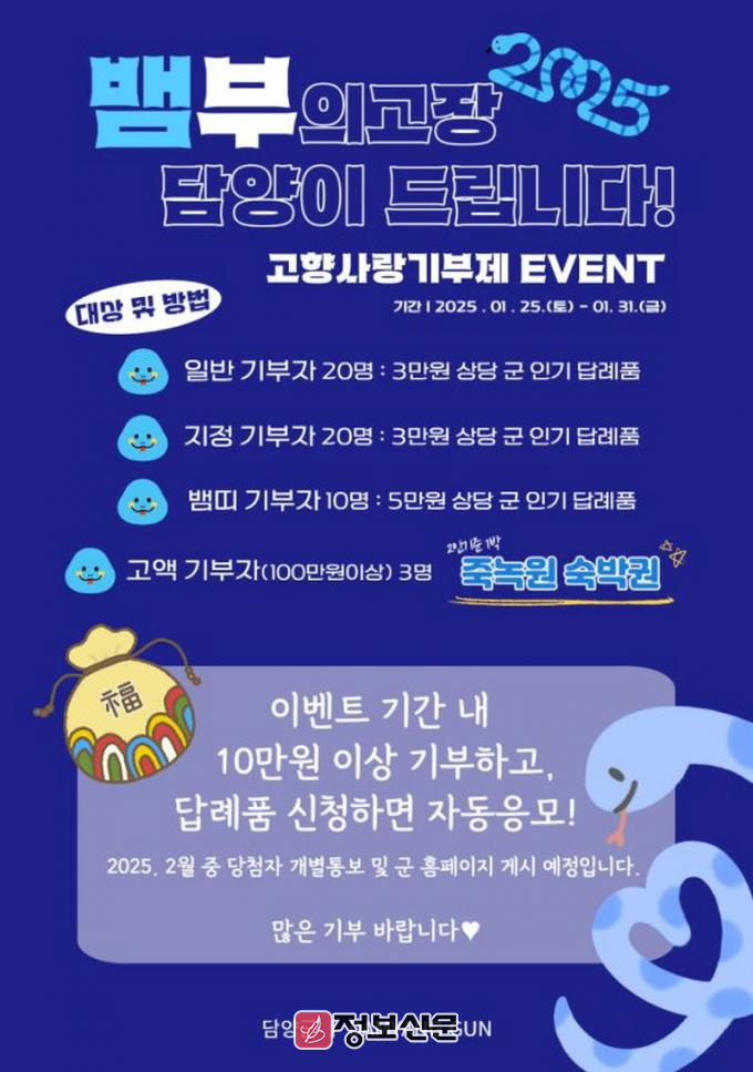 이뿐만 아니라, 푸른 뱀의 해를 맞아 추가로 뱀띠 기부자 10명을 추첨해 답례품을 증정할 예정이며, 추첨을 통해 100만 원 이상 고액 기부자 3명에게는 ‘죽녹원 1박 숙박권’의 혜택도 제공한다.