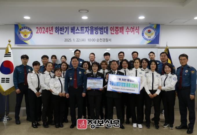 순천경찰서(서장 국승인)는 지난 22일 전남경찰청 주관 2024년 하반기 베스트 자율방범대로 선정된 순천경찰서 여성자율방범대에 인증패와 감사장을 수여했다.