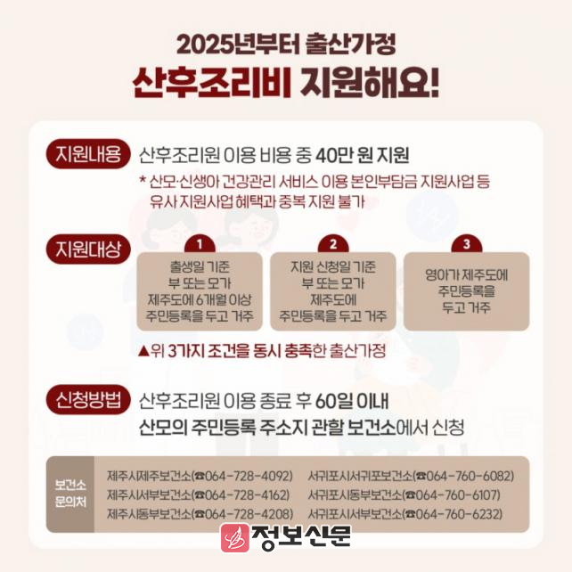 신청은 보건소 방문 접수 및 온라인(정부24, e보건소 공공보건포털)에서 할 수 있으며 자세한 사항은 서부보건소 모자보건실(☎064-760-6232)로 문의하면 된다.