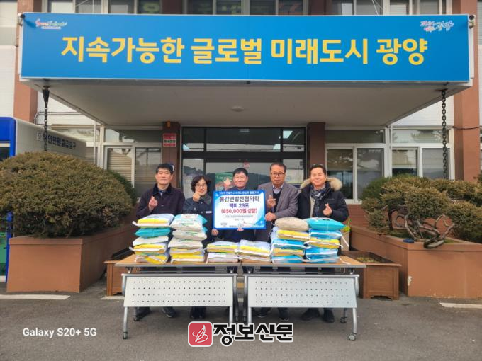 김영희 봉강면장은 “이번 기부로 이웃과 정을 나눌 수 있게 됐다. 봉강면은 봉강면발전협의회와 함께 지역민들을 지원하고 새로운 희망을 드릴 수 있도록 노력하겠다”고 말했다.