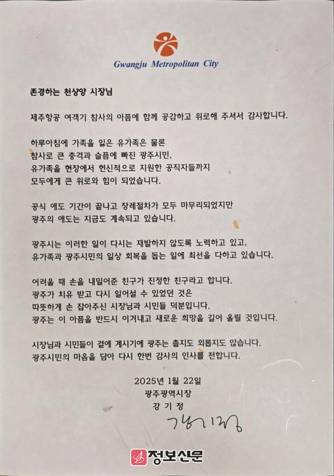 강기정 광주시장은 “제주항공 여객기 참사의 아픔에 함께 공감하고 위로해주셔서 희생자 유가족, 시민 등 모두에게 큰 위로와 힘이 됐다”며 “이러한 일이 다시는 재발하지 않도록 노력하는 한편 이들의 일상 회복을 돕는 일에 최선을 다하고 있다. 여러분 덕에 광주가 치유받고 다시 일어설 수 있었다”고 감사의 마음을 전했다.