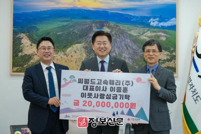 제주특별자치도는 23일 오후 도청 집무실에서 씨월드고속훼리 이종훈 대표이사와 임원진이 제주 고향사랑기부금 1,000만원과 취약계층을 위한 기부금 2,000만원을 제주도사회복지공동모금회에 전달했다고 밝혔다.