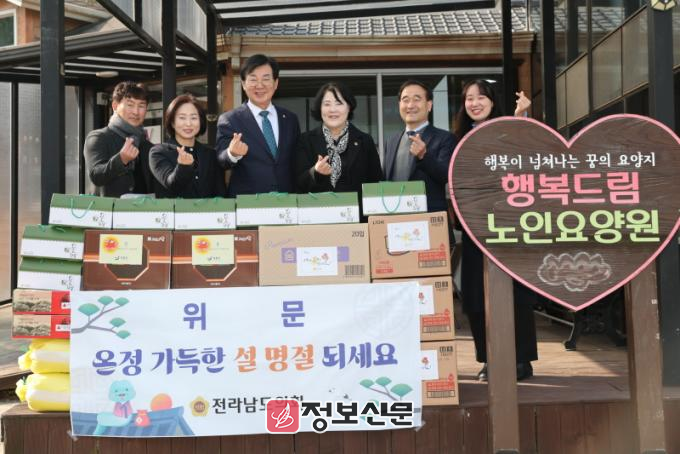![]() 전라남도의회 윤명희 의원이 지난 1월 23일 행복드림노인요양원을 방문해 위문품을 전달하고 있다.[전남도의회 제공] |
