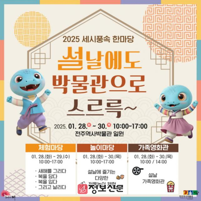 먼저 전주역사박물관은 ‘설날에도 박물관으로 스르륵~’을 주제로 가족 단위 관람객들이 함께 즐길 수 있는 다양한 체험 프로그램을 마련했다.