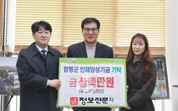 함평군은 30일 “㈜수도씨앤지가 지난 24일 오전 인재양성기금에 3백만원을 기탁했다”고 밝혔다.