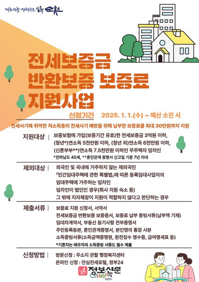 ![]() 순천시, 전세보증금 반환보증 보증료 지원사업 시행 |