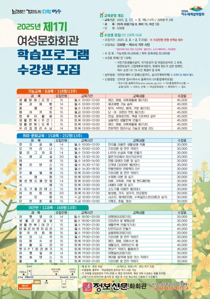 ![]() 여수시 여성문화회관, 제1기 학습프로그램 수강생 모집 |