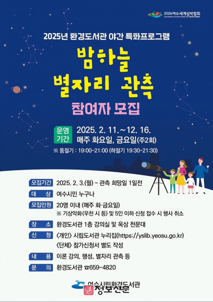 ![]() 여수시립환경도서관에서 오는 2월부터 ‘밤하늘 별자리 관측’ 야간 특화프로그램 참여자를 모집한다.