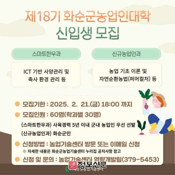 ![]() 화순군, 제18기 화순군농업인대학 신입생 모집 |