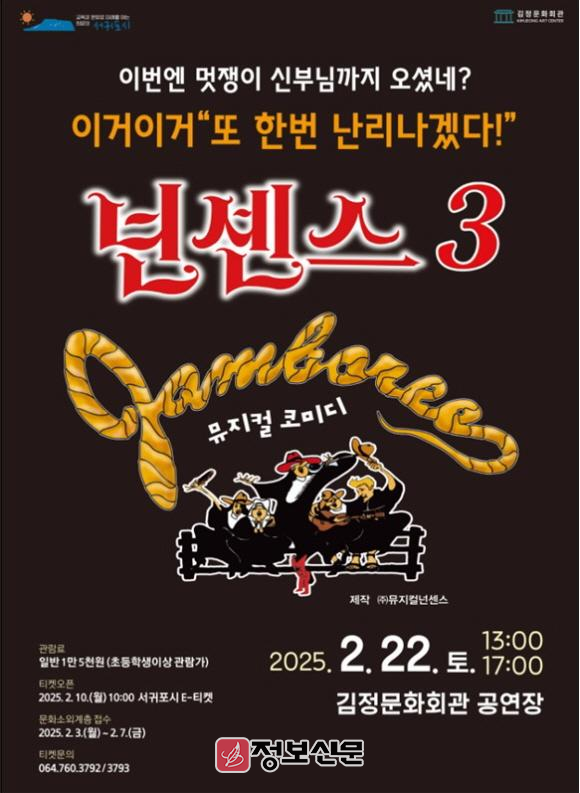 뮤지컬 <넌센스 3>는 초등학생 이상 관람이 가능하며 2월 10일(월) 오전 10시부터 서귀포시 E-티켓을 통하여 1만 5천원에 예매할 수 있으며, 문화소외계층의 무료 초대는 2월 3일(월)부터 2월 7일(금)까지 김정문화회관에 전화로 신청 가능하다.