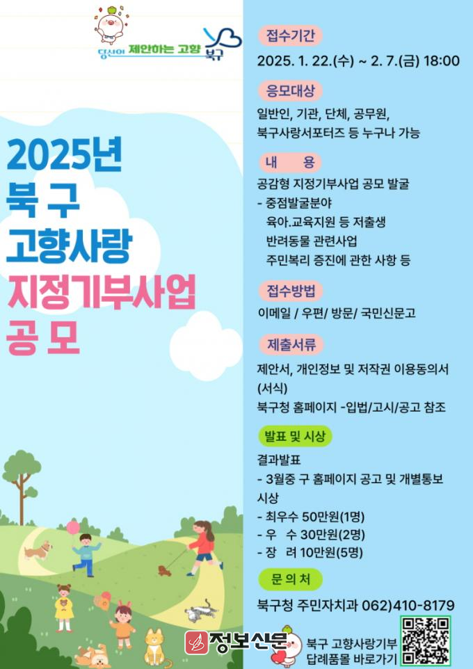 ![]() 광주시 북구, 고향사랑기금 ‘지정기부사업’ 공모 진행 |
