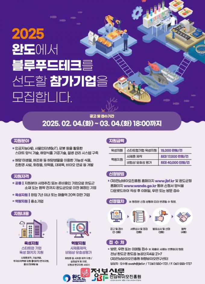 사업 신청은 3월 4일까지이며 완도읍 농공단지에 위치한 해양바이오연구센터로 방문 또는 우편으로 하면 된다. 자세한 내용은 (재)전남바이오진흥원 또는 완도군 누리집에서 확인할 수 있다.