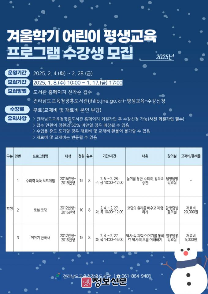 ![]() 장흥도서관, ‘겨울학기 어린이 평생교육 프로그램’ 운영 |
