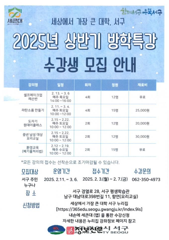 이번 방학 특강은 정규 프로그램이 없는 계절학기 기간에 교육 공백을 해소하고 주민들의 학습 수요를 충족시키기 위해 마련됐다. 운영 기간은 2월 11일부터 3월 6일까지 3주간이며, 수강 신청은 2월 7일까지 ‘세큰대’ 누리집(www.seogu.gwangju.kr/365edu) 또는 “내손에 세큰대” 앱을 통해 할 수 있다.