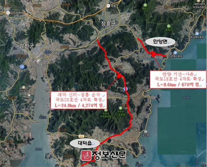 이번에 선정된 사업은 ▲국도23호선 대덕 신리~장흥 순지 24.8km 구간(4,274억 원) 4차로 확장사업과 ▲국도18호선 안양 기산~사촌 8.6km 구간(670억 원) 4차로 확장사업이다.