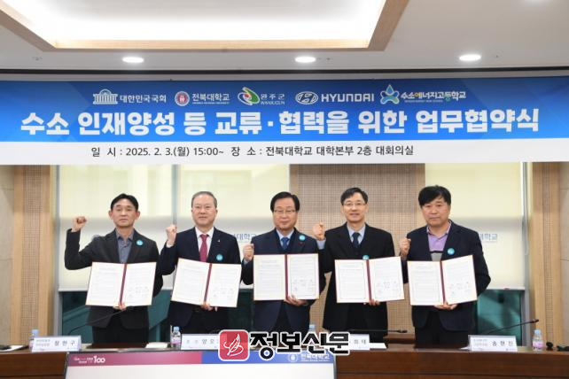이번 업무협약에는 유희태 완주군수, 국회 환경노동위원장 안호영 국회의원, 전북대학교 양오봉 총장, 권덕철 JBNU 지역발전연구원장, 현대자동차 장현구 전주공장장, 수소에너지고 송현진 교장 등이 참석했다. 이들은 상호 협력체계 구축을 통한 지역사회 성장, 수소산업 발전과 수소산업분야 전문 인재양성을 육성하는데 함께 뜻을 모았다.