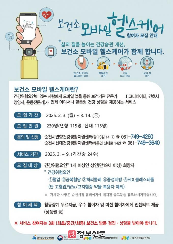 ![]() 순천시, 2025년 보건소 모바일 헬스케어 사업 참여자 모집 |