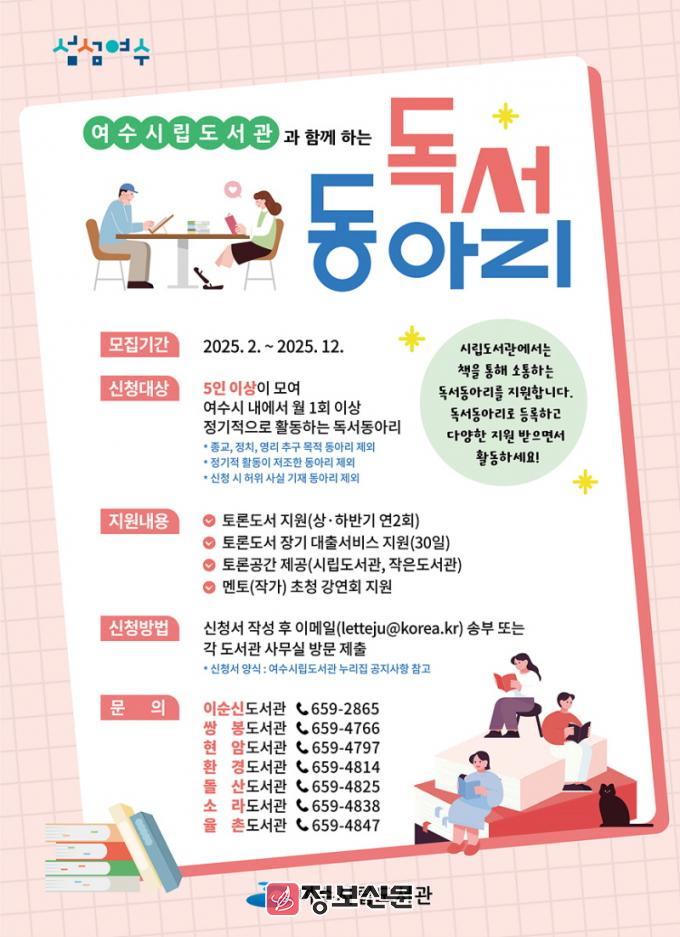 ![]() 여수시립도서관, 신규 독서동아리 상시 모집 |