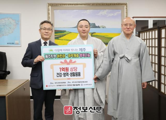 이날 오후 제주도청 행정부지사 집무실에서 진행된 전달식에는 법인 정책실장 문법 스님과 대한불교천태종 문강사 주지 덕준 스님을 비롯한 ‘(사)나누며하나되기’ 임원, 대한적십자 제주지사 노시천 나눔교육팀장, 오의합 제주시여성의용소방대장, 김인춘 제주시어린이집연합회장 등이 참석했다.
