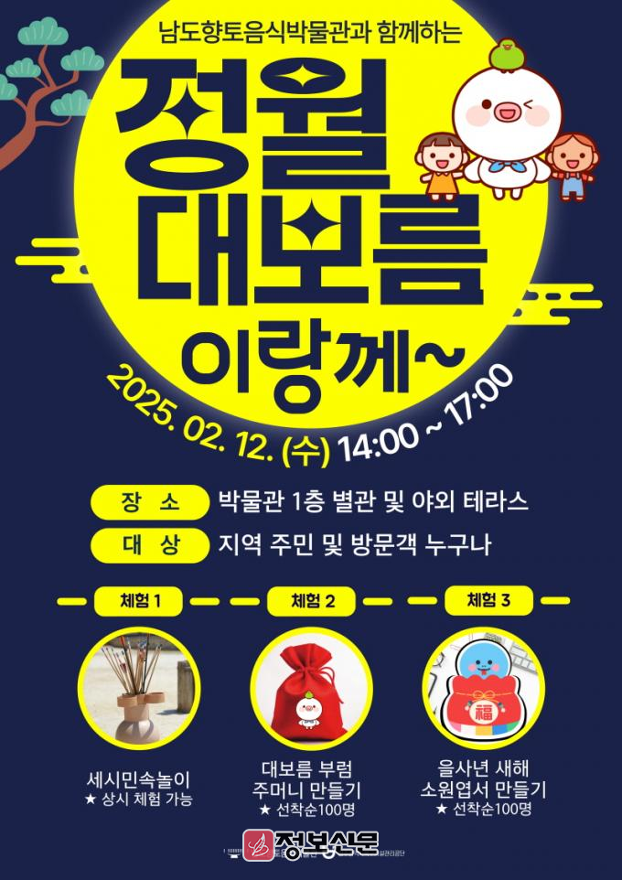 남도향토음식박물관의 2025년 첫 세시풍속 행사인 이번 프로그램은 누구나 참여 가능하며, 대보름 부럼 주머니와 소원엽서 만들기는 선착순으로 현장 접수로 진행된다.