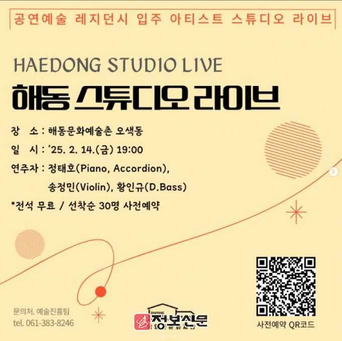 담양군문화재단 관계자는 “해동 스튜디오 라이브는 녹음과 공연을 동시에 진행하는 실험적인 방식의 무대”라고 말하며, “아티스트와 관객이 작품의 제작 과정, 창작 의도 등을 색다른 방식으로 공유하게 되길 바란다.”라고 밝혔다. 이번 프로그램은 선착순 30명에 한하여 구글 링크(포스터 QR코드 확인)로 사전 예약 가능하다.