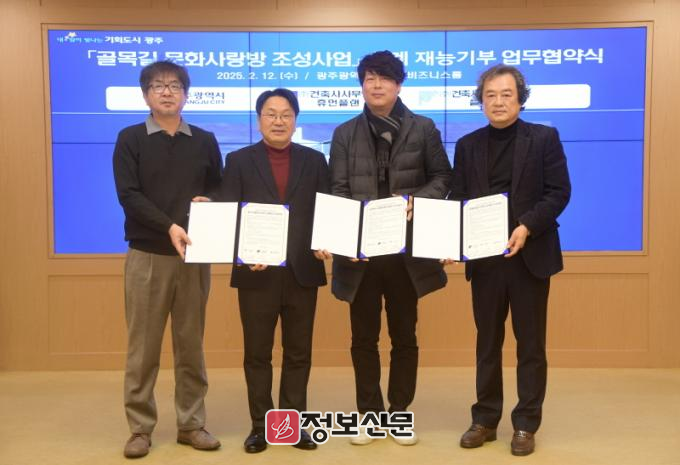 광주광역시(시장 강기정)는 12일 시청 비즈니스룸에서 휴먼플랜건축사사무소, 플랜건축사무소와 ‘골목길 문화사랑방 조성사업 설계 재능기부 업무협약(MOU)’을 체결했다.
