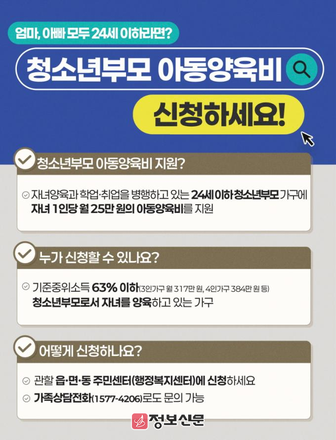 자녀양육과 학업·취업을 병행하는 청소년부모 가구에 자녀 1인당 월 25만 원을 지원하며, 기준중위소득 63% 이하(3인 가구 월 317만 원·4인 가구 384만 원 등)인 청소년부모로 자녀를 양육하는 가구라면 신청할 수 있다.