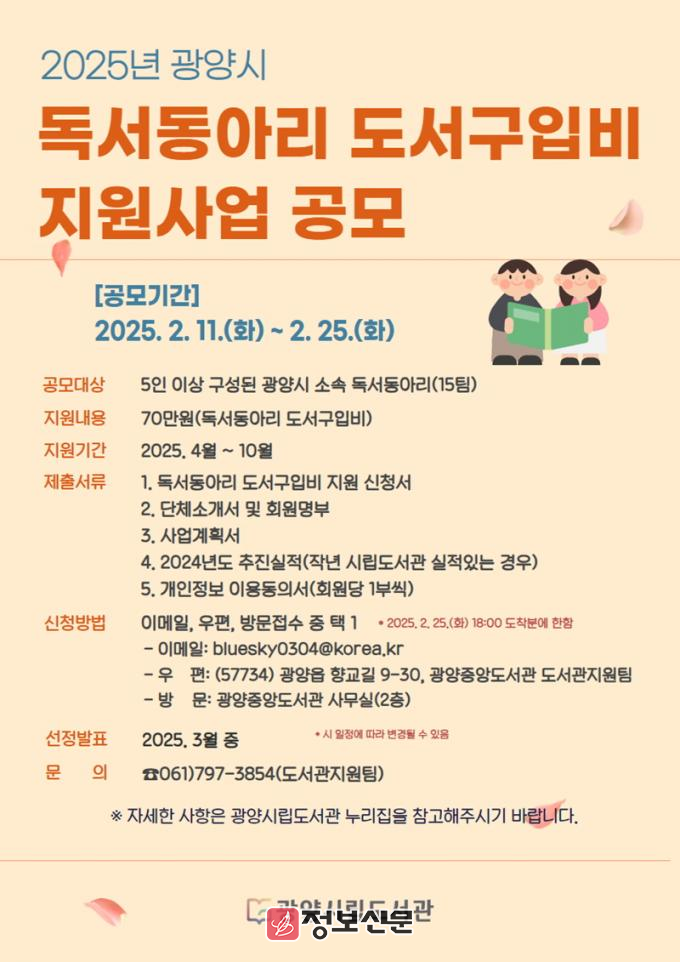 ![]() 광양시, 2025년 독서동아리 도서구입비 지원사업 공모 |