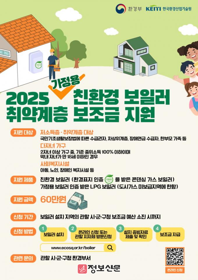 보조금이 지원되는 친환경 보일러는 한국환경산업기술원의 환경표지 인증을 받은 제품이다. 도시가스 미공급지역의 경우 목재연료‧연탄‧기름보일러를 가정용 보일러로 인증받은 LPG보일러로 교체해도 지원받을 수 있다.