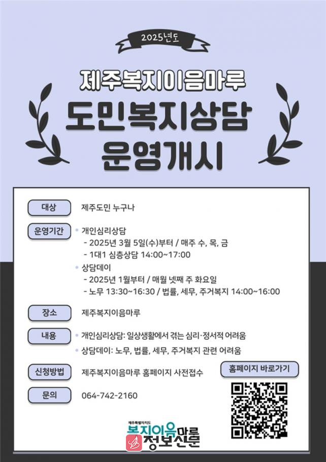 ![]() 제주복지이음마루, 심리·법률·노무·세무·주거복지 분야 전문 상담 운영 개시 |