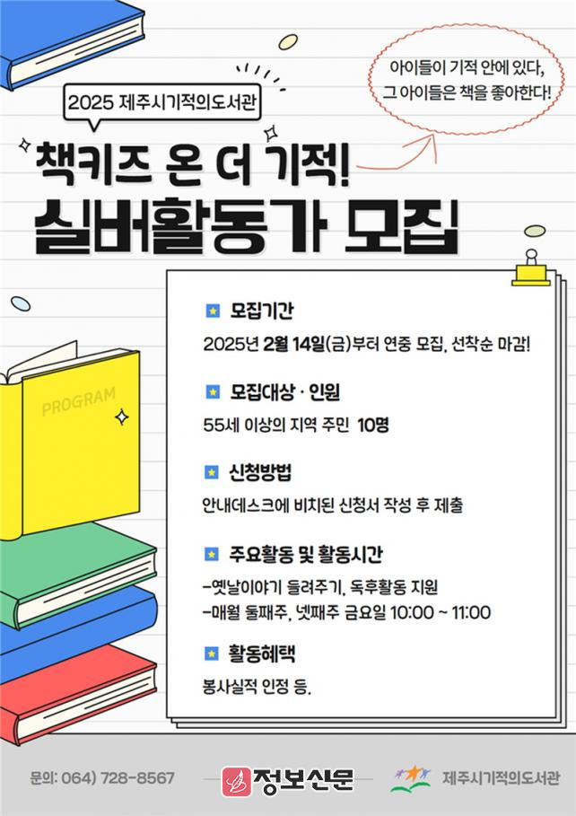 ![]() 제주시기적의도서관, 책키즈 온 더 기적 운영 실버활동가 모집 |
