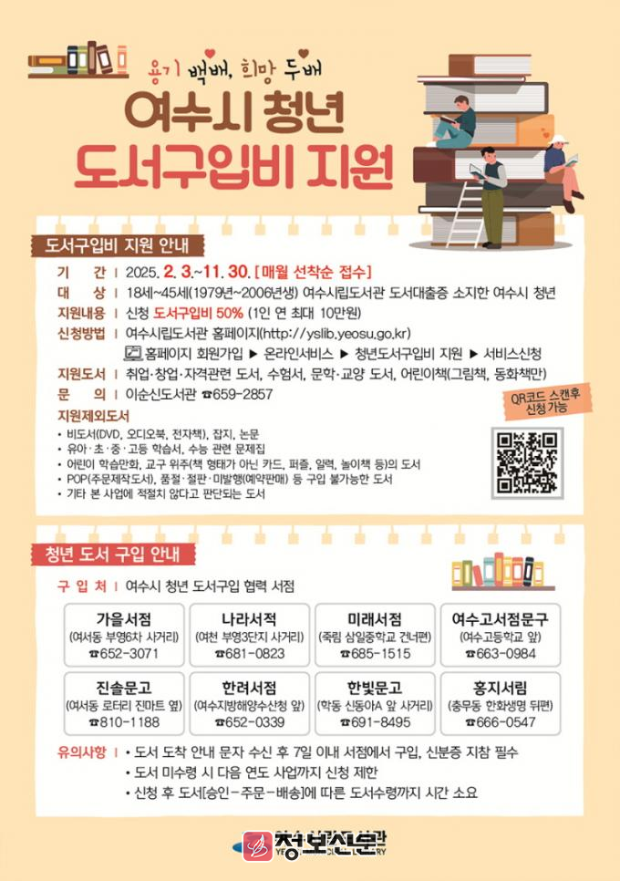 청년 도서구입비 지원 사업에 대한 자세한 내용은 시립도서관 누리집(yslib.yeosu.go.kr)에서 확인하거나 도서관운영과(☎061-659-2857)로 문의하면 된다.