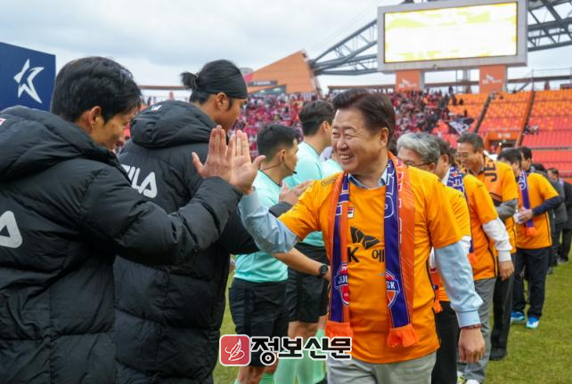 오영훈 지사는 제주 SK FC 유니폼을 입고 참석해 선수단과 관계자들을 격려하고, 승리와 K리그 정상 도전을 응원하는 의미를 담아 시축에 나섰다. 경기에 앞서 오 지사는 월드컵 홍보관에서 아동복지보육원 중등부 축구팀 만나 응원과 격려를 전하고 제주 SK FC 및 SK에너지 관계자들과 스포츠 및 신산업 발전 협력 방안을 논의했다.