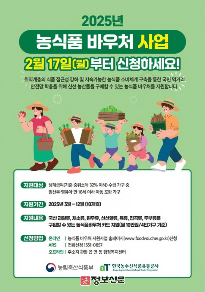 지원 대상은 임산부·영유아·만 18세 이하 아동이 있으며 중위소득 32% 이하의 생계급여 수급 가구로 올해 3월부터 12월까지 10개월간 농식품 바우처 카드를 지원받을 수 있다.