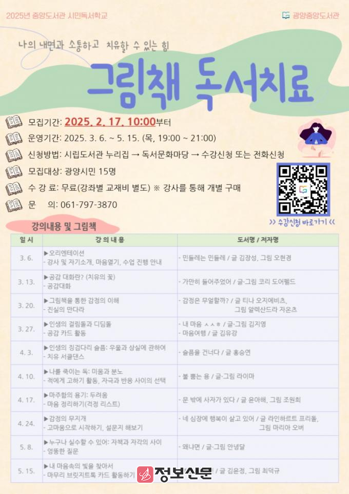 ![]() 광양중앙도서관, 상반기 ‘시민독서학교’ 수강생 모집 |