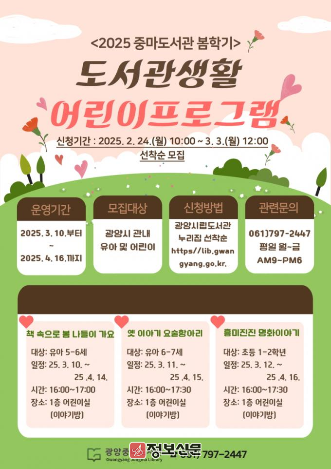 중마도서관 봄학기 도서관 생활 어린이 프로그램 수강 신청과 궁금한 사항은 광양시립도서관 누리집(http://lib.gwangyang.go.kr)에 설명돼 있으며, 중마도서관(☎797- 2447)에 문의해도 친절한 안내를 받을 수 있다.