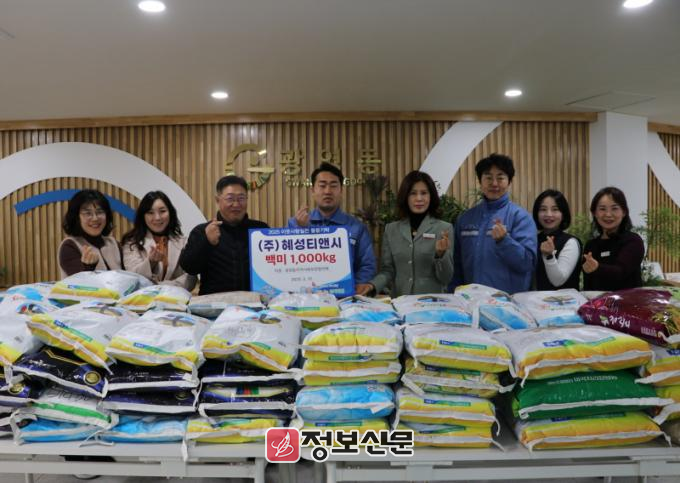 이번 기탁은 ㈜혜성티앤시가 지난 2월 6일 본사 및 종합정비 공장 준공식에서 받은 축하 화환 쌀 2,000kg 상당을 광영동과 태인동에 나눠 기탁한 것으로, 지역사회와 함께하는 기업의 사회환원 활동이라는 점에서 의미를 더했다.