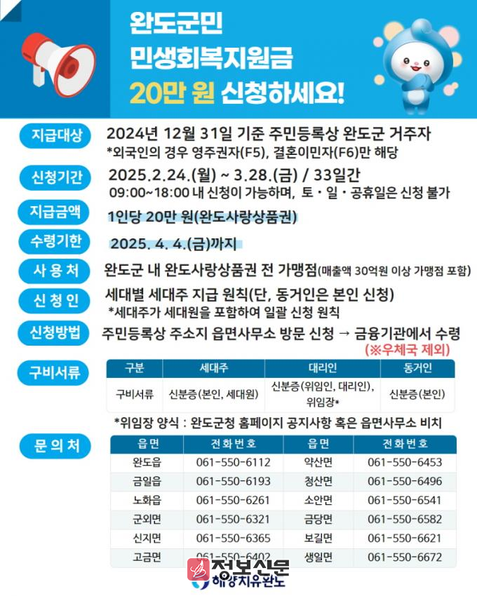 ![]() 완도군, 민생회복지원금 3월 28일까지 신청하세요 |