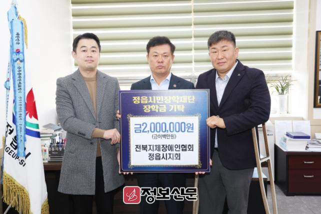 같은 날 전북지체장애인협회 정읍시지회(회장 송현)도 200만원을 기탁하며 나눔에 동참했다. 송현 회장은 “회원들이 십시일반 모은 성금이 지역 학생들에게 작은 보탬이 되길 바란다”고 말했다.