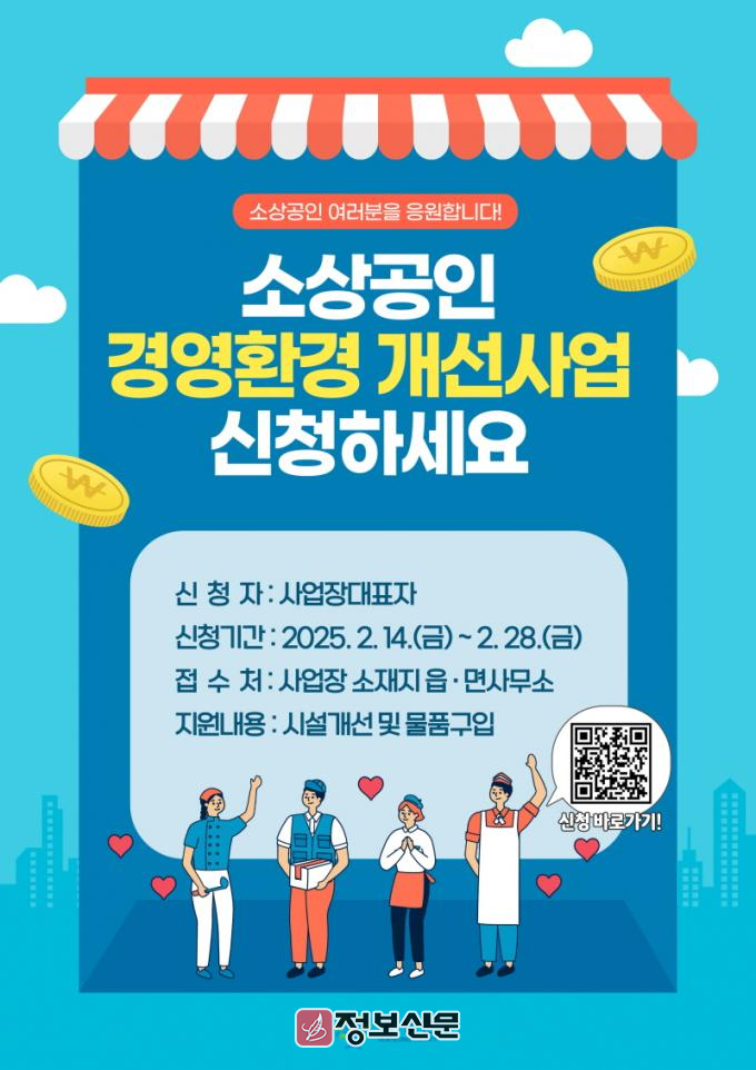 경영환경 개선사업은 소상공인 사업장의 실내·외 시설개선비를 최대 7백만 원까지, 영업에 필요한 업소용 물품 구입비를 최대 2백만 원까지 지원하는 사업이다. 군이 2014년부터 매년 추진해 온 사업으로 지역 소상공인의 경영 여건을 개선하는 데 실질적인 도움이 되는 만큼 만족도가 특히 높다.