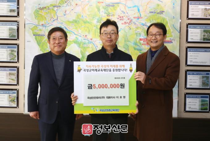 ㈜곡성안전유리(대표 이호영)는 지난 13일 곡성군미래교육재단에 청소년들의 진로 탐색을 위한 기부금을 전달하였다. 이호영 대표는 작년에 300만 원에 이어 올해 500만 원의 기부금을 2년 연속 기부하였다.
