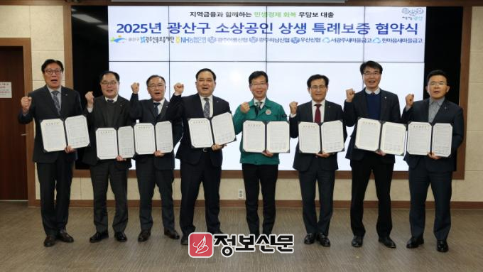 광산구는 17일 광주신용보증재단, 농협은행, 광주어룡신협, 광주하남신협, 우산신협, 서광주새마을금고, 한마을새마을금고와 소상공인 상생 특례보증 업무협약(MOU)을 체결했다.