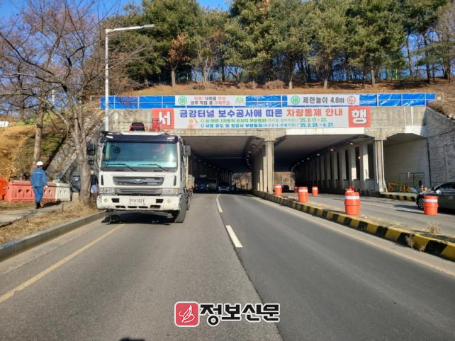 시는 작년 4월경 금강터널 남측 갱문 상단에서 콘크리트 균열 및 탈락 등이 발생하자 이에 대한 긴급 안전조치를 시행했다. 이후 정밀 안전 진단용역을 거친 뒤 보수보강계획을 수립해 사업에 착수했다.