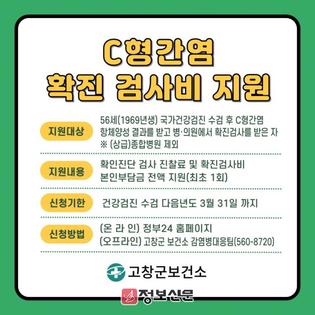 지원 대상은 56세(1969년생) 국가건강검진 수검 후 C형간염 항체 양성 판정을 받고 병‧의원에서((상급)종합병원 제외) 확진 검사를 받은 군민들이다.