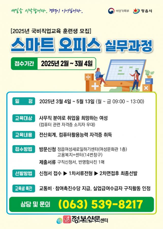 ![]() 정읍시여성새로일하기센터, 스마트 오피스 실무과정 교육생 모집 |