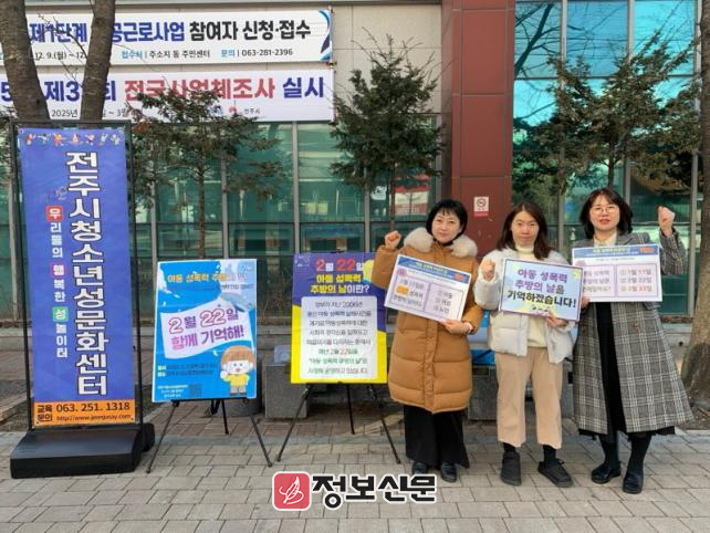 특히 이번 캠페인에는 전주와 군산, 익산, 정읍 등 전북특별자치도내 4개 청소년성문화센터가 함께 참여해 아동 성폭력 근절을 위한 동참을 호소했다. 캠페인에 참여한 한 시민은 “이번 캠페인을 통해 2월 22일이 아동 성폭력 추방의 날이라는 것을 제대로 기억할 수 있게 됐다”고 참여 소감을 밝혔다.